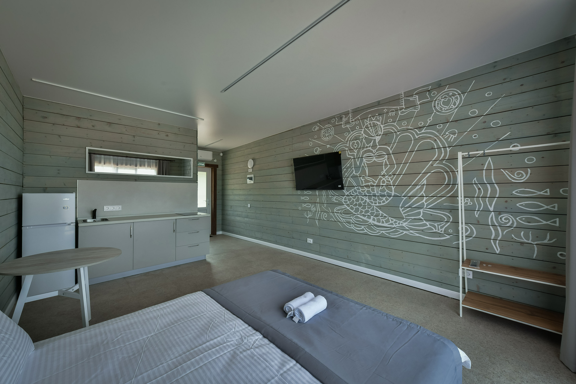 2-х комнатный номер (кухня-гостиная, спальня). Спальня – двуспальная кровать, гостиная – раскладной диван.